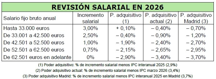 - El nuevo convenio ha eliminado el vínculo entre el IPC y la revisión salarial, sustituyéndolo por porcentajes fijos. En consecuencia, con una inflación superior al 1%, la pérdida de poder adquisitivo está asegurada para la mayoría de la Es lo que sucedió el año pasado y lo que ocurrirá –agravado– ahora.