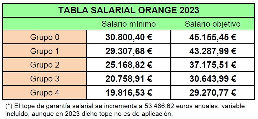 - SUBIDA DEL 6% para las trabajadoras y trabajadores del convenio que tengan un salario bruto fijo (sin incluir variable) igual o inferior a 39.714,87 € euros anuales. Esta subida tiene el carácter de ”garantía mínima obligatoria”, por lo que el incremento podría ser mayor si aplica la bolsa de igualdad (el presupuesto específico para paliar la diferenciación salarial entre mujeres y hombres de Orange), o bien si la Dirección decide, de manera discrecional, aumentar el porcentaje de revisión salarial.