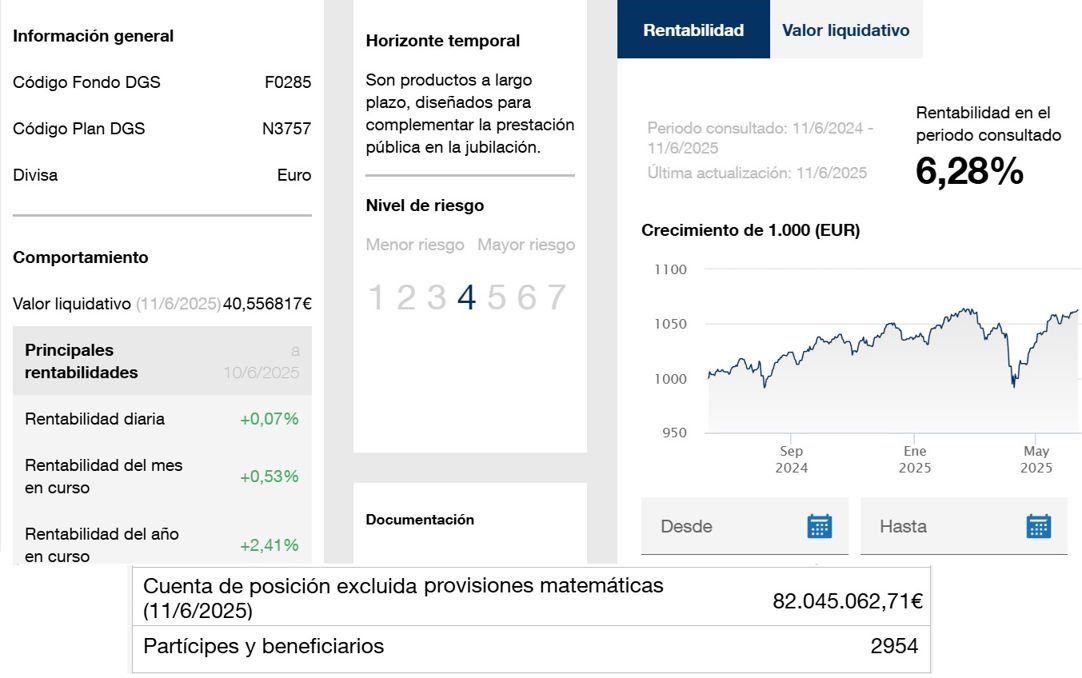 Todo ese dinero constituye el fondo económico del plan, que a día de hoy cuenta ya con más de 82 millones de euros y 2.954 partícipes o beneficiarios. Ese dinero se invierte en diversas partidas de todo tipo (letras, bonos, acciones…) con vistas a conseguir el mejor equilibrio entre la rentabilidad del plan y la seguridad de las inversiones. De hecho, durante los últimos 12 meses, la rentabilidad del fondo ha superado el 6%, un porcentaje que, vistos los actuales tipos de interés, está bastante bien.