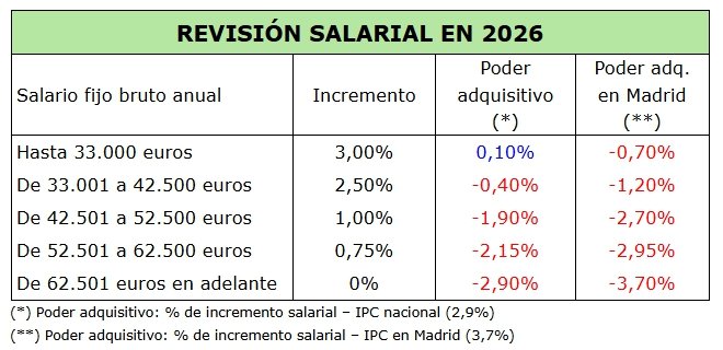Recordamos que la próxima revisión salarial está prevista para el mes de abril. Se hará conforme a la siguiente tabla: