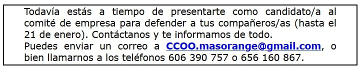 También puedes escribirnos a CCOO.masorange@gmail.com o contactar con tu delegado o delegada de CCOO de MasOrange en Madrid, Barcelona, Sevilla, Valladolid, Valencia, Vigo, A Coruña, Asturias, Zaragoza, Euskadi, Salamanca, Alicante, Málaga, Las Palmas de Gran Canaria…