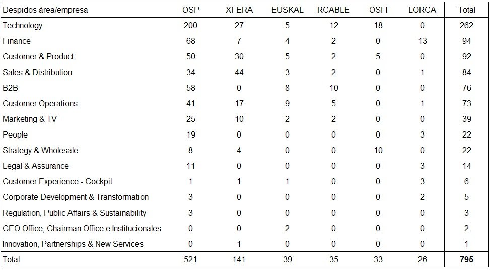 NOVENO. Si se analizan los despidos por áreas, la más afectada es Tecnología (Sistemas de información y Redes) con 262 despidos previstos, aunque porcentualmente respecto al volumen de plantilla el mayor palo se lo llevan en Operaciones y en Finanzas. Mencionamos por curiosidad el caso de RR.HH. (People), donde de sus 22 despidos previstos 19 son para Orange.