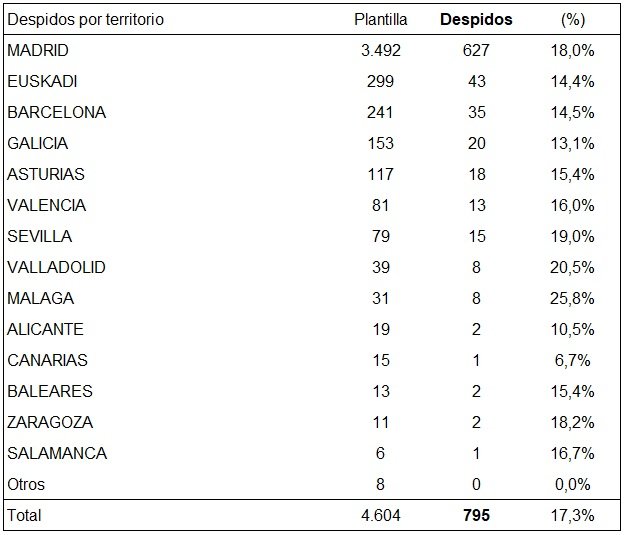 DÉCIMO. Por territorios, según la Dirección, hay personal sobrante en Madrid, Euskadi, Barcelona, Galicia, Asturias, Valencia, Sevilla, Valladolid, Málaga, Alicante, Canarias, Baleares, Zaragoza y Salamanca. Madrid, con mucha diferencia, es la provincia con más despidos (627); en relación al volumen de plantilla, Málaga y Valladolid son los grandes damnificados.