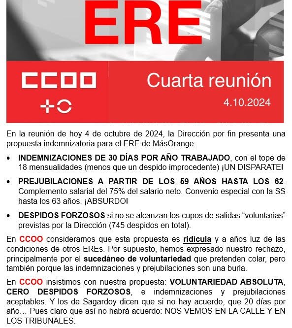 En CCOO estamos en contra del ERE de MásOrange y por eso seguimos emprendiendo acciones sindicales, varias de ellas en colaboración con otras organizaciones, porque creemos que únicamente desde la presión y la unidad sindical podremos conseguir defender los puestos de trabajo en la compañía y, sobre todo, que no haya ni despidos ni prejubilaciones forzadas.