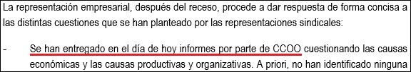Pese a lo anterior, el día 25 de septiembre, en CCOO teníamos ya preparada una primera versión del contrainforme, que expusimos en la reunión del ERE de ese día, como queda acreditado en estos extractos del acta: