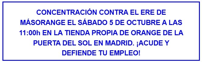• Concentración contra el ERE de MásOrange el jueves 10 de octubre a las 19:30h, frente a la Tienda de Orange VALENCIA (Carrer de Colón, 58), convocada por el Comité de Empresa.