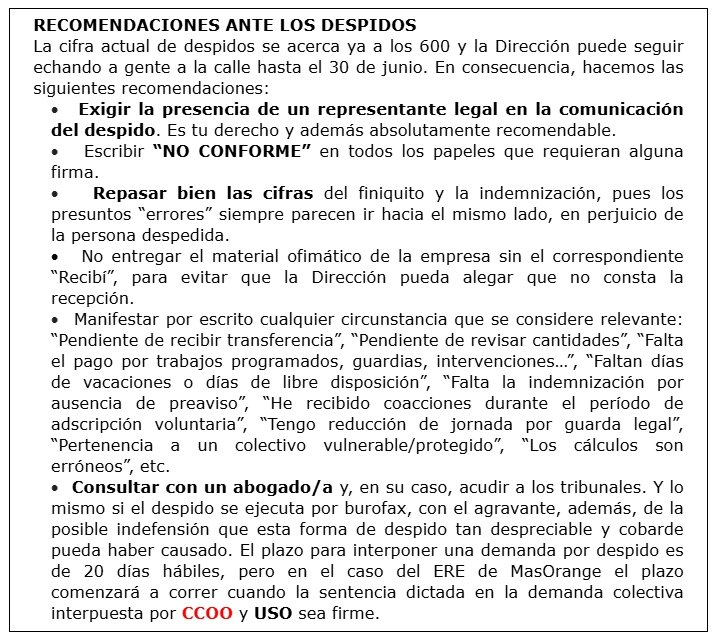 En CCOO reiteramos una vez más nuestra oposición frontal al ERE forzoso de MasOrange y exigimos ponerle fin de manera inmediata, sin llevar a cabo las cincuenta y pico extinciones laborales restantes. Lo que desde luego no hacemos es reclamar que las ejecuciones pendientes se tramiten de manera sumaria. Es más, ningún sindicato debería solicitar esa barbaridad. Por muy mala conciencia que tengan por su complicidad en estos despidos y quieran pasar página rápidamente, no tienen derecho a pedir que se aceleren las ejecuciones y mandar a la cola del paro a parte de la plantilla a la mayor velocidad posible.
