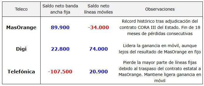 Según los últimos datos publicados, MasOrange ha alcanzado un saldo neto de portabilidades de 89.900 líneas en banda ancha fija gracias al contrato con la Administración General del Estado conseguido en julio, lo que además permite romper una racha de pérdidas que la empresa arrastraba desde su creación.