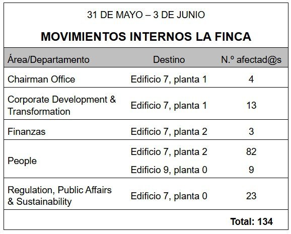 Este viernes prosiguen los movimientos internos en Madrid, que afectan a 134 personas trabajadoras de la Finca, que se cambian de edificio o planta, y la mudanza de 55 empleados/as procedentes de Alcobendas, que aterrizarán a partir de la próxima semana en los edificios 5 y 7 de La Finca.