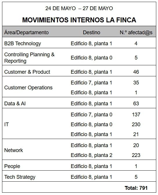 Se producirá también otra oleada de traslados del personal de MásMóvil de Alcobendas hacia La Finca (187 personas) y a las oficinas de Palos de la Frontera (9 personas).