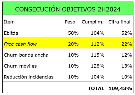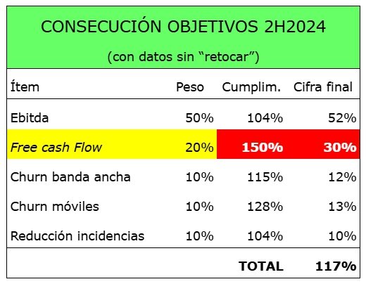 - Hace varias semanas, uno de los sindicatos del ERE había intentado disfrazar de “trabajo interno” la filtración del 109% que les habían hecho desde la Dirección: una trola burda e infantil, porque con los datos publicados (1.496M€ de ebitda y 463M€ de free cash flow) y sin información de los tres últimos objetivos (churn banda ancha, churn móviles y reducción incidencias) el posible rango de consecución en ese presunto trabajo interno habría sido amplísimo: de un 82% a un 127%… Y eso sin tener en cuenta lo que ha ocurrido con el objetivo del free cash flow, donde la cifra publicada no se parece a la finalmente “elegida”.