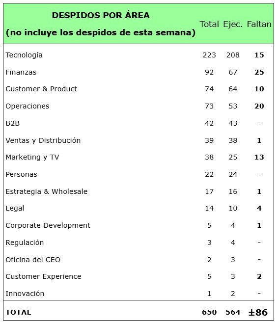 La siguiente tabla refleja la distribución de los despidos por áreas de la compañía efectuados en 2024 o “agendados” para realizarse en 2025; no incluye, por tanto, los despidos de estos últimos días. Son datos extraídos de la documentación que la Audiencia Nacional obligó a la Dirección a remitir a CCOO por la demanda presentada: