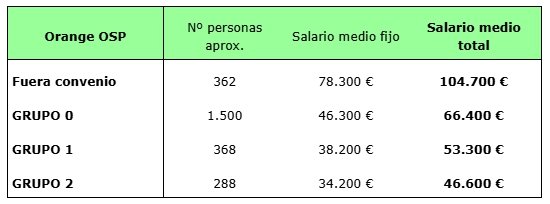 En consecuencia, si bien el salario fijo promedio en Orange rondaría los 48.300 euros/persona, cuando se contemplan todas las partidas económicas salariales esta cifra podría ascender a los 67.700 euros/persona de salario total. La diferencia entre estas dos cantidades tiene fácil explicación: el salario total incluye el sueldo fijo, el variable (mínimo del 15% en Orange y asegurado por convenio, aunque es muy superior en determinados colectivos –p.e. comerciales y personal de dirección–) y la retribución en especie, que puede suponer unos 7.000 euros/año por empleado entre la ayuda a comida, los seguros médicos para el trabajador/a, su cónyuge y sus hijos/as, el tráfico telefónico, el plan de pensiones, las ayudas por hijos/as, las ayudas sanitarias y el resto de las ayudas sociales, el plan familia, el plus de movilidad sostenible, etc. Hay que considerar además otros pluses como guardias, trabajos programados, releases, GRIET, etc. Por todo lo anterior, podemos afirmar que esta revisión salarial supone sin duda una disminución generalizada de la capacidad económica para la mayoría de la plantilla de Orange porque: